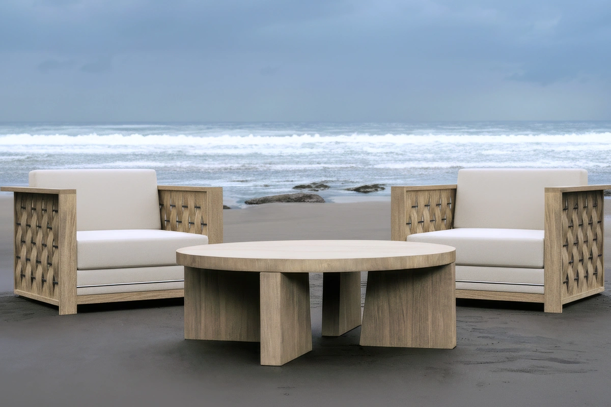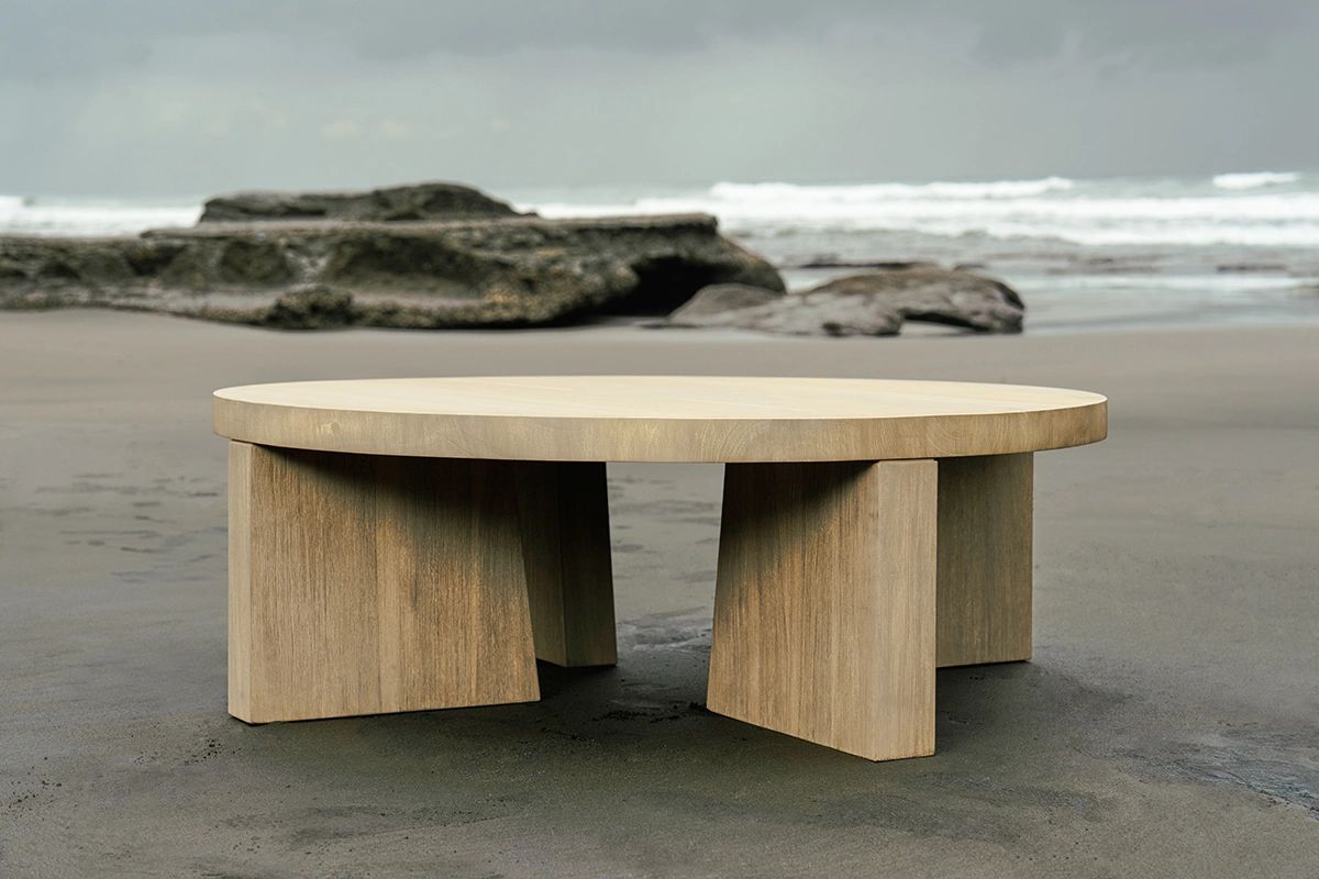We’ve given your teak a soft finish to start with, so it already feels smooth and inviting to the touch. Over time, the wood will naturally shift from its muted brown tone to a silvery-gray patina. During this transition, you may notice a subtle “moiré” effect as the wood’s natural oils rise and interact with moisture in the air. This is a normal stage in teak’s weathering process and can be easily rinsed away with soapy water. As with any outdoor piece, your furniture may collect pollen, dust, or other airborne particles. Frequent hosing will keep it clean and help it weather evenly